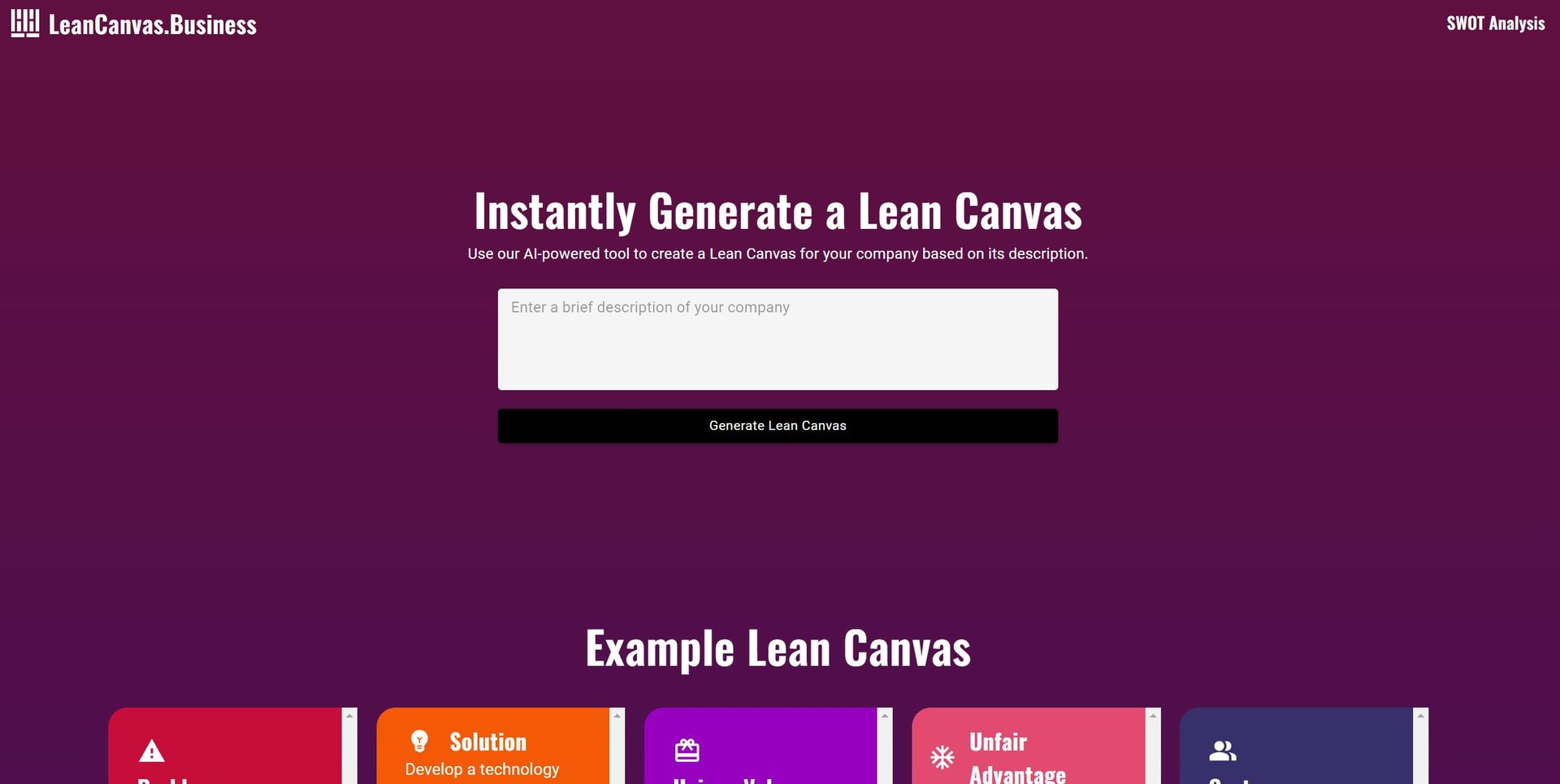 • AI-Powered Canvas Creation: Generates detailed lean canvases automatically based on user input.