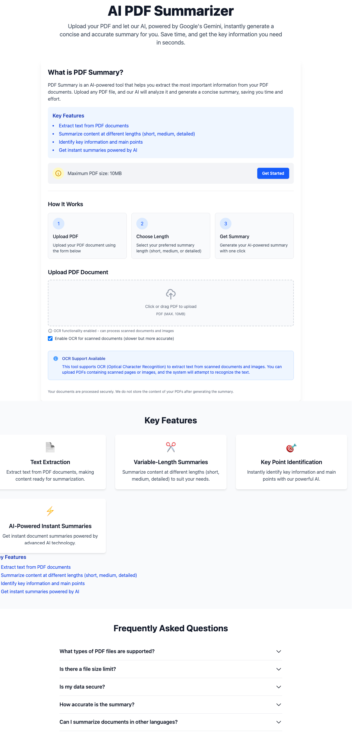 AI PDF Summarizer is an innovative tool that allows users to upload PDF documents and receive concise, accurate summaries generated instantly by AI technology powered by Google Gemini. This tool is perfect for anyone looking to quickly digest information without sifting through lengthy texts.