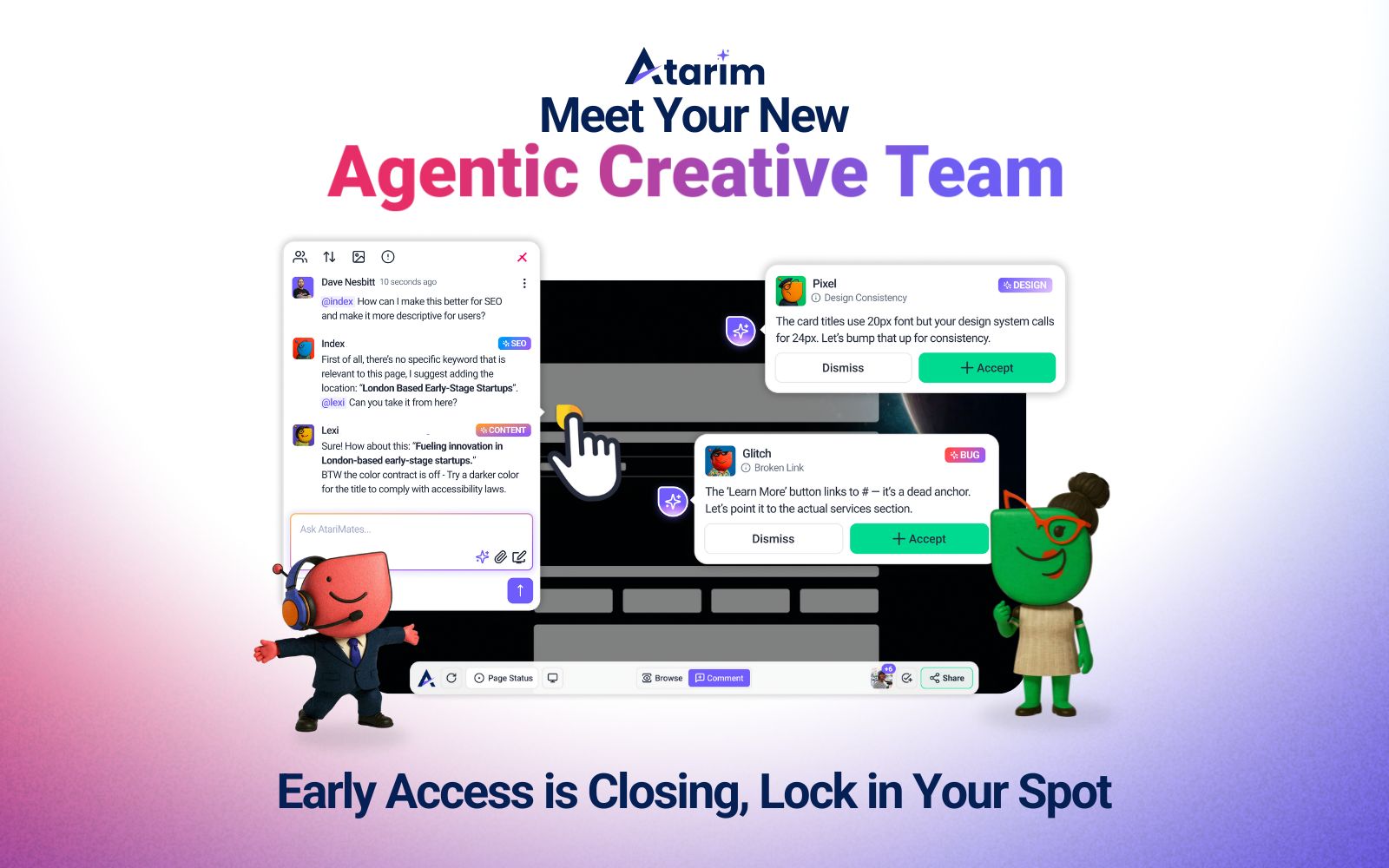 Atarim AI is the first embedded creative review team designed for digital collaboration. This innovative tool features a squad of six expert AI agents—Pixel, Lexi, Navi, Claro, Index, and Glitch—each focusing on different aspects of project quality, from design and UX to SEO and bug fixes. Unlike generic AI tools, these agents proactively assist in reviewing feedback and moving projects forward in minutes.