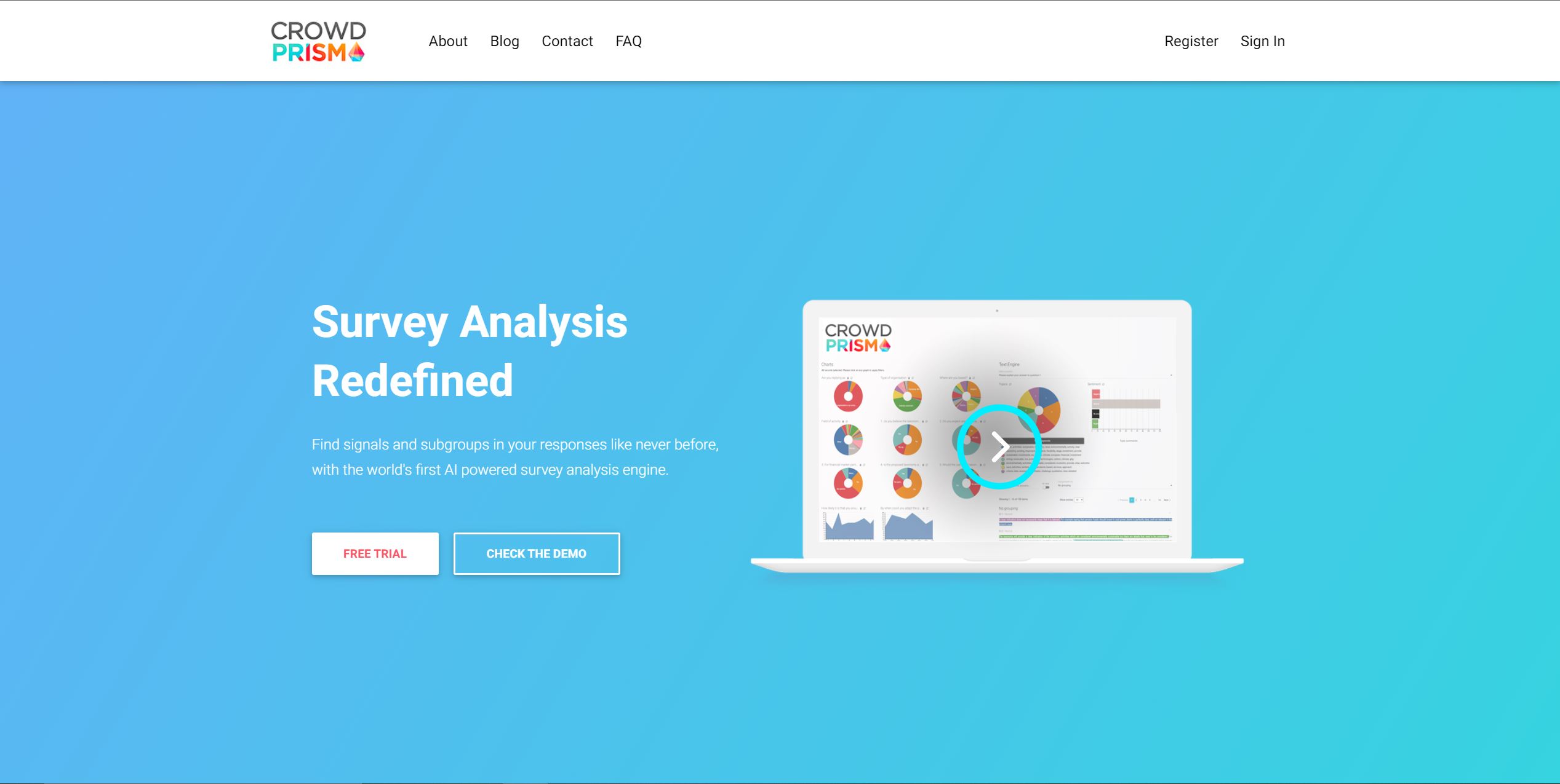 CrowdPrisma is an innovative survey analysis tool that applies artificial intelligence (AI) and Natural Language Processing (NLP) to transform the way survey responses are analyzed. This platform enables users to extract significant insights and uncover patterns from large volumes of free-text responses within a fraction of the time required for manual analysis.