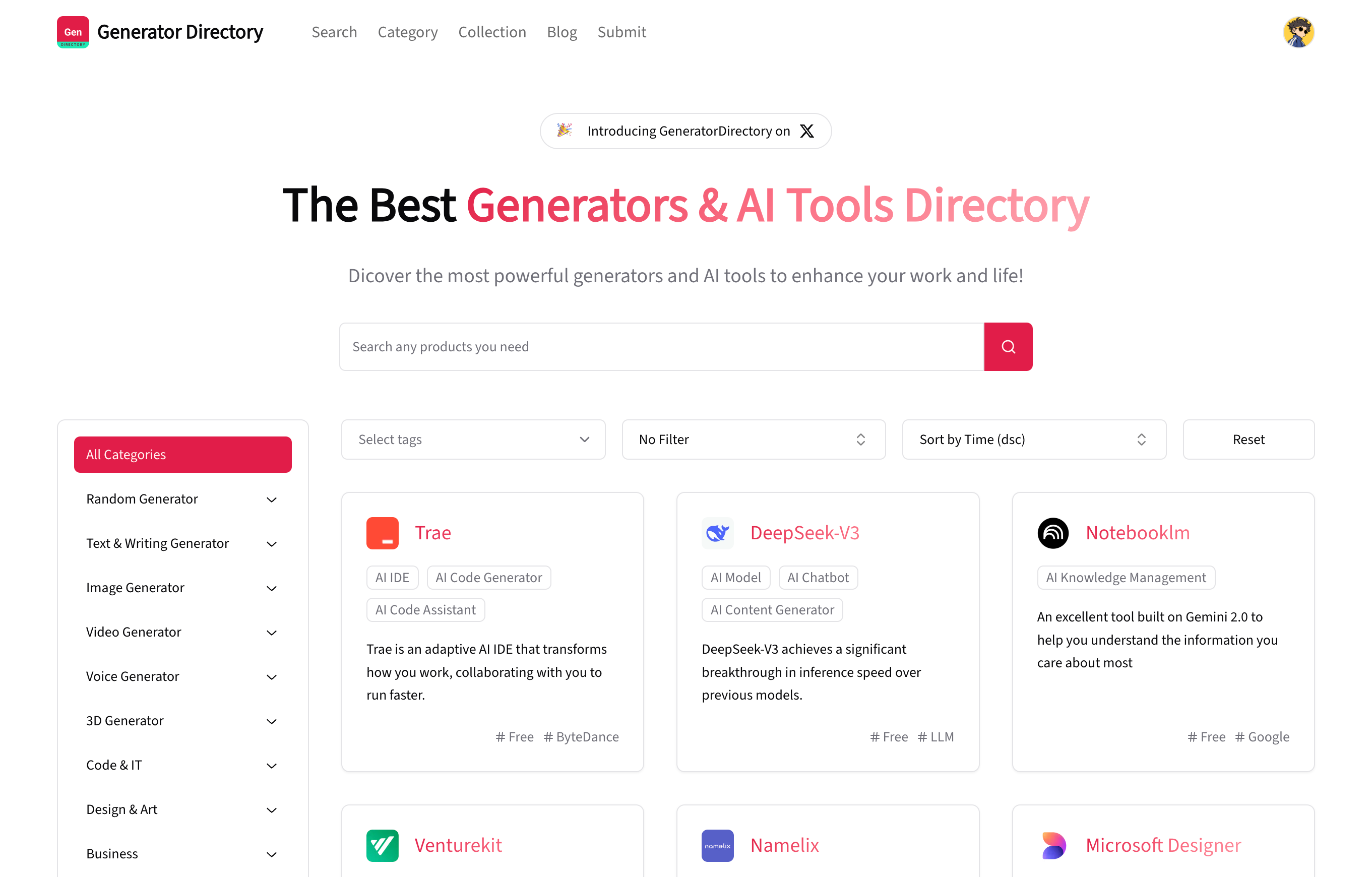 Generator Directory is a comprehensive platform that showcases the most powerful generators and AI tools designed to enhance both your work and personal life. With an extensive list of resources, it aims to simplify your search for the right tools to boost productivity and creativity.