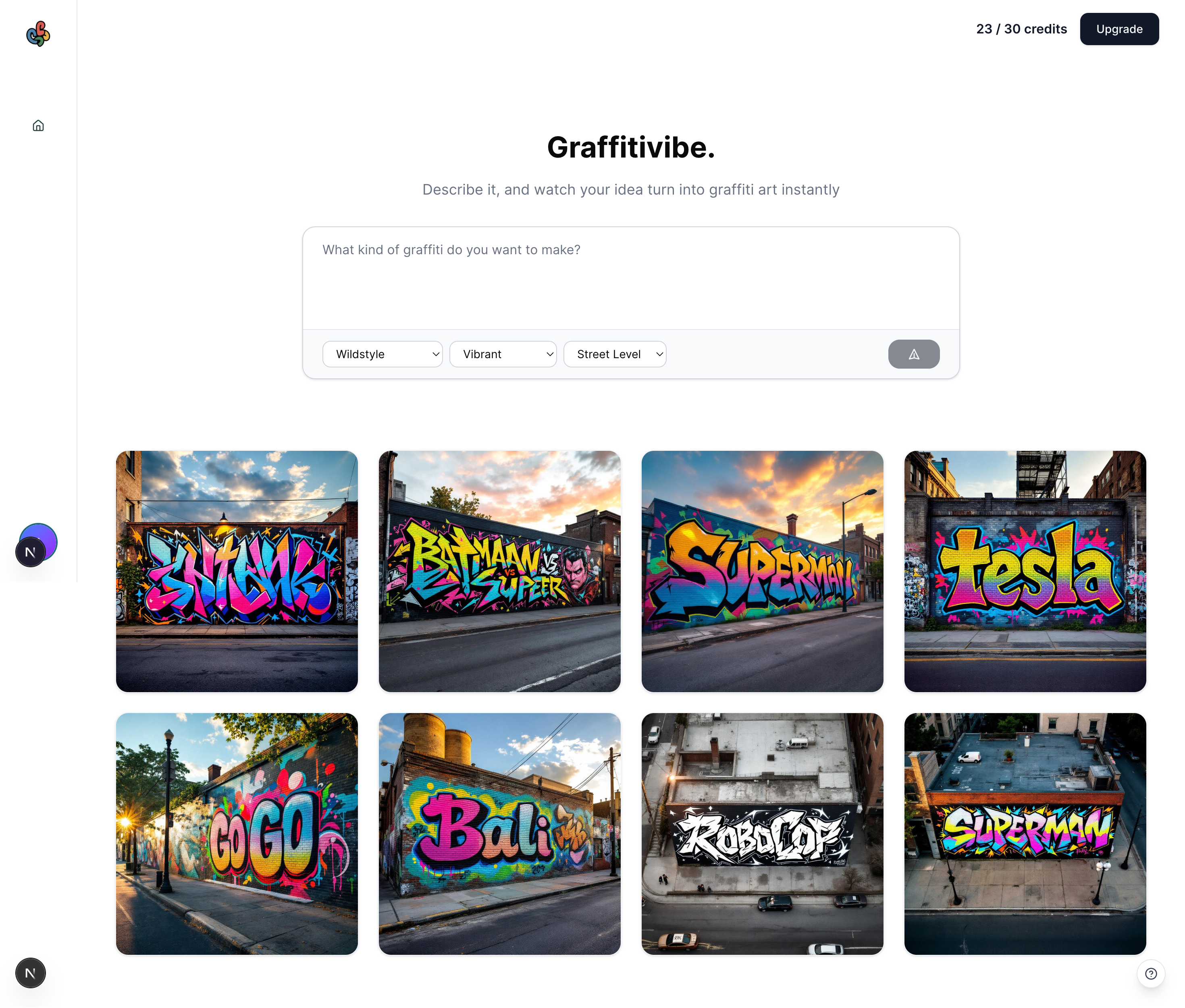 GraffitiVibe is an AI-powered graffiti generator that instantly transforms your text descriptions into unique graffiti art. This innovative tool brings your words to life in a vibrant and artistic manner, allowing for creative expression like never before.