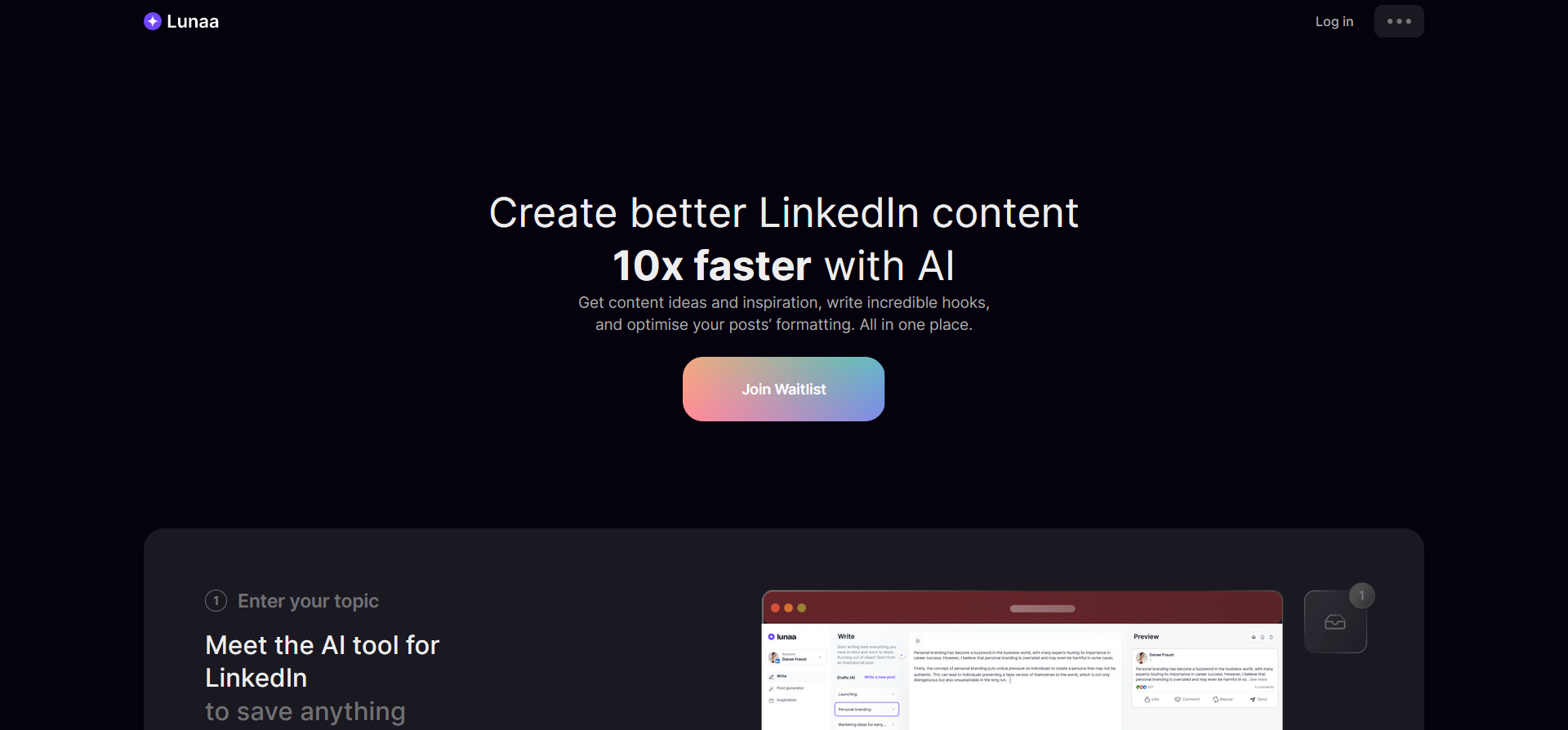 Lunaa is a LinkedIn-focused AI tool designed to help professionals and businesses enhance their presence on the platform. It simplifies LinkedIn strategy with features like AI-generated content, post formatting, and upcoming scheduling and analytics tools. Ideal for marketers, entrepreneurs, and professionals, Lunaa saves time while boosting networking, lead generation, and personal branding efforts.