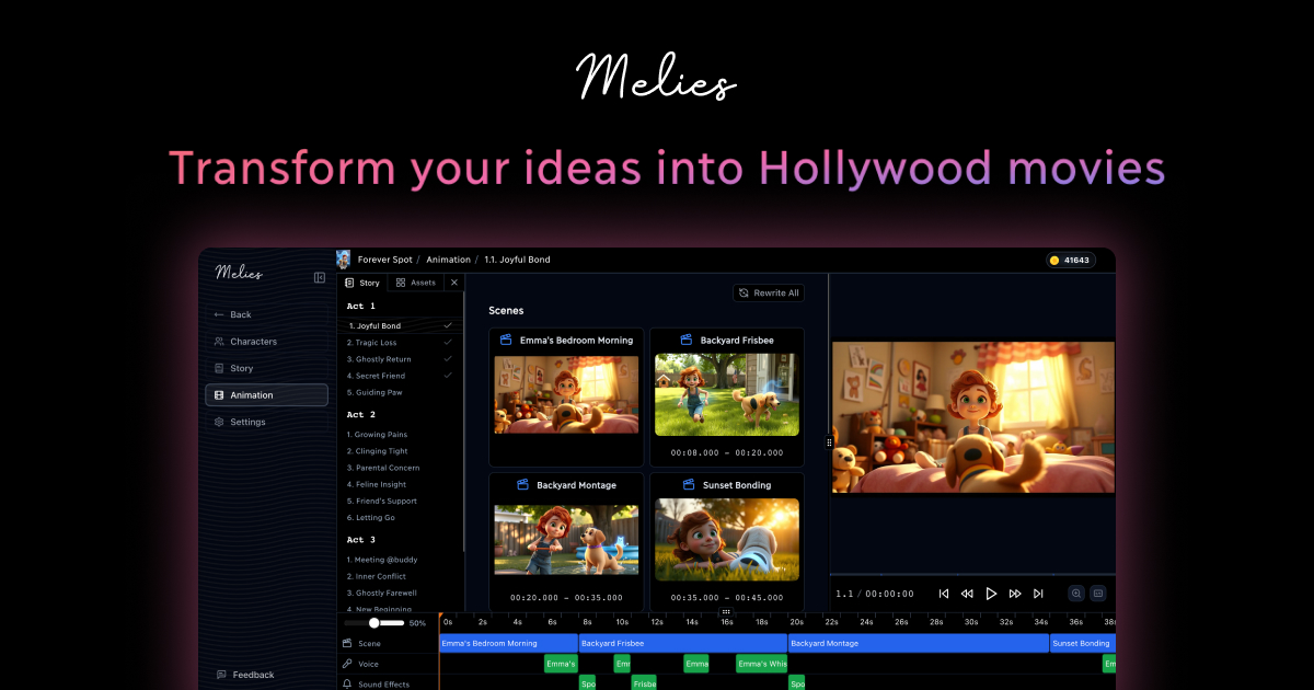 Melies stands out as a powerful tool for filmmakers, enabling the transformation of ideas into films with AI's assistance. Its focus on asset generation and story development makes it a valuable resource for aspiring and established filmmakers alike.