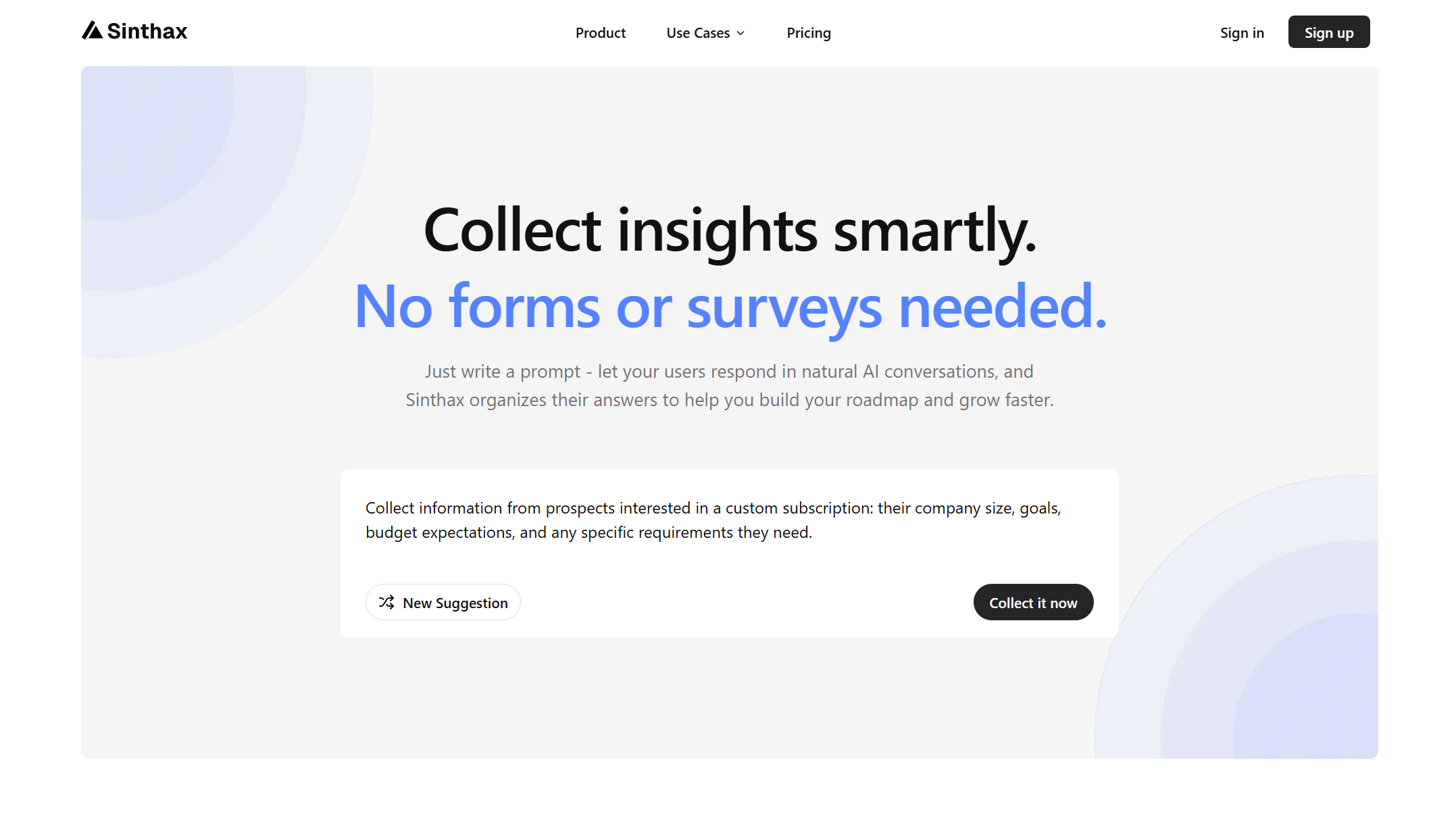 Sinthax replaces traditional surveys and forms with a smarter, conversational approach to collecting feedback and insights, making it easier to engage users.