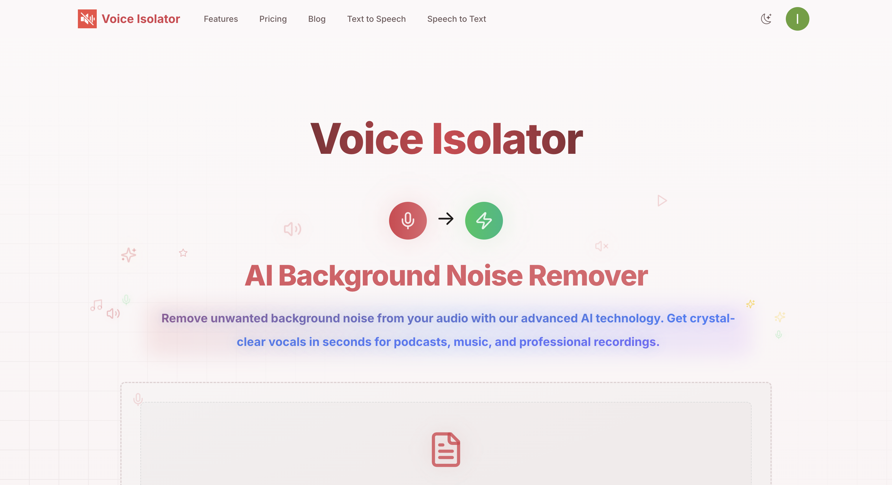 Voice Isolator is an advanced AI voice isolation tool designed to effortlessly remove background noise and extract clean vocals from any audio file. Whether you're a music producer, content creator, podcaster, or video editor, this tool helps you achieve studio-quality sound with just a few clicks.