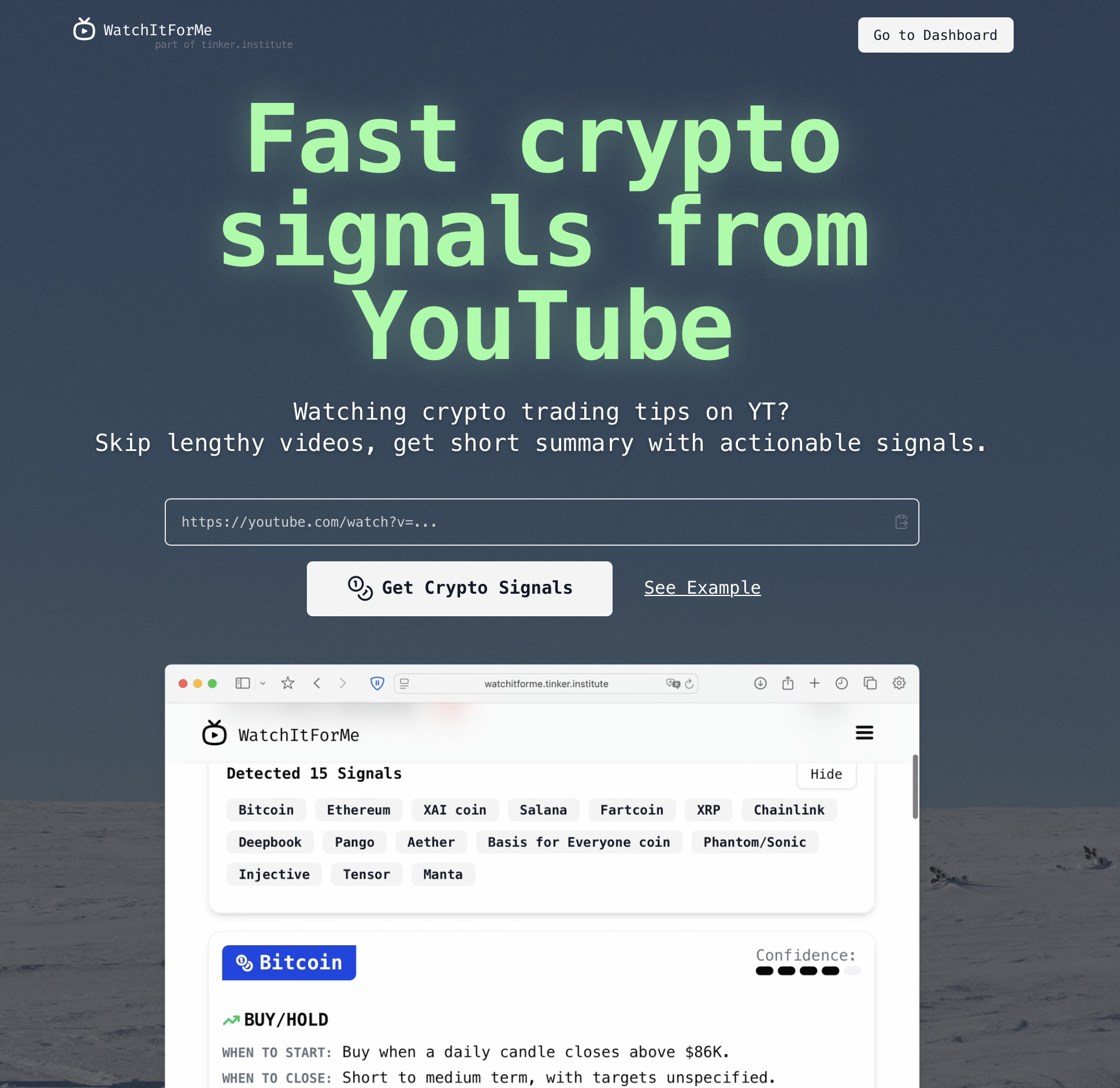 WatchItForMe is an innovative tool designed for crypto enthusiasts who want quick insights from YouTube videos. Instead of spending hours watching lengthy content, users can simply drop a video link and receive a summary of every coin mentioned, along with actionable BUY, HOLD, and SELL trade signals, complete with price bands.