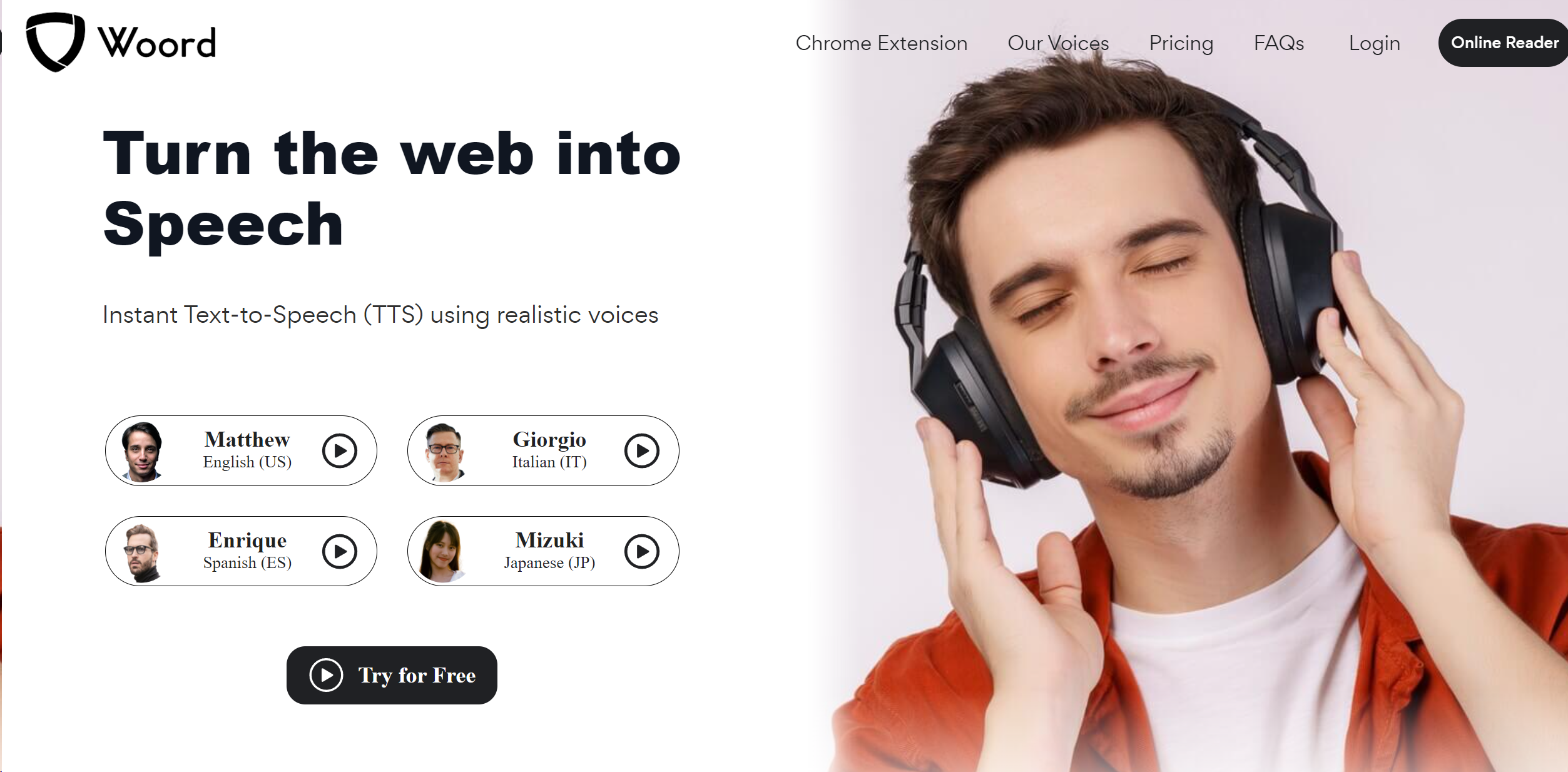 Woord is a cutting-edge online Text-to-Speech (TTS) tool designed to convert written text into audio with natural, high-quality voices. It supports a diverse range of languages and voice options, offering a seamless solution for transforming text into speech for various applications, including blog posts, audiobooks, and e-Learning content.